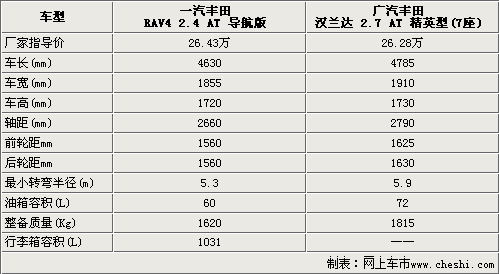 SUV市场一直是车市中增长比较强劲的一股力量,尤其是受到都市人喜爱的城市SUV车型。在新车层出不群的同时,竞争也在逐渐加大。丰田汽车就看准了这一市场,在今年上半年分别于一汽丰田和广汽丰田,投产了两款城市SUV车型:RAV4和豪华城市SUV汉兰达,售价分别为18.98万—26.43万和24.88-42.98万元。从两款车型的售价上看,在25万这个价格区间都有车型销售。那么这两款同品牌、同价位不同级别的城市SUV,它们都各自有什么特点和优势呢?为了能让您可以更加清楚地了解它们,我们选取了一汽丰田RAV4 2.4自动导航版和广汽丰田汉兰达2.7精英型7座这两款车型,来做一个全方位的对比。一汽丰田RAV4 2.4自动导航版售价为26.43万元,广汽丰田汉兰达2.7精英型7座的售价为26.28万元,两款车型的售价仅相差了1500元。