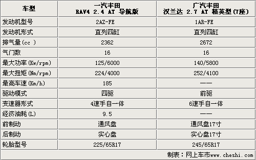 一汽丰田RAV4 2.4自动导航版和广汽丰田汉兰达2.7精英型7座这两款车型都采用的是直列四缸的引擎,只是在发动机排量上不同。汉兰达和RAV4的发动机都具有丰田独步天下的VVT-i技术,实现了卓越的动力输出,同时进一步提高了燃油经济性。在变速器方面,RAV4就相对比较落后了,只采用了4档自动变速器。而汉兰达的6速手自一体变速箱则可以让驾驶者充分的享受到驾驶的乐趣。一汽丰田RAV4和广汽丰田汉兰达都采用的是前通风盘式后实心盘式的刹车,但汉兰达的刹车盘达到了17寸,可以更有效的降低刹车距离。