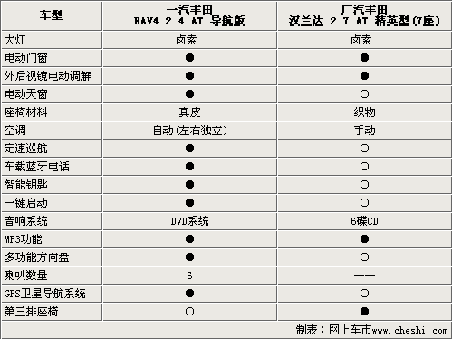一汽丰田RAV4 2.4自动导航版和广汽丰田汉兰达2.7精英型7座的舒适配置相差比较悬殊。RAV4 2.4自动导航版属于RAV4车系中的顶配车型,舒适配置可谓是应有尽有,电动天窗、真皮座椅、自动空调、定速巡航、多功能方向盘、DVD影音系统等设备都成为了标准配置。而汉兰达2.7精英型7座属于该车系中的低配车型,在舒适配置方面尽显于基本使用。但在空间利用上汉兰达还是比较具有优势的,首先汉兰达最多可以承载7名乘客,而且室内空间可以灵活多变,放倒比例达到了4:2:4,可以更加有效的方便乘客置放大件物品。