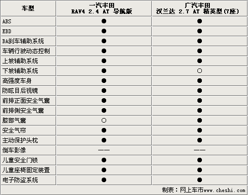 从上表我们可以看到,在电子主动安全系统的配备中,ABS+EBD、动态稳定系统和6安全气囊均成为了一汽丰田RAV4 2.4自动导航版和广汽丰田汉兰达2.7精英型7座的标准配置。但仔细看下来它们还是略有不同。丰田RAV4再配备了上坡辅助系统的同时,还配备下坡辅助系统,确保车辆在斜坡上能以稳定速度的行驶。而汉兰达则是配备了膝部气囊,可以有效的降低事故发生后对乘客的伤害。比较遗憾的是这两款车型均没有配备倒车辅助系统。