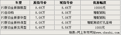 F3新白金版延续了F3靓丽的外形和高效的动力以及贯有的节油性能,在配置上做了全方位的升级。新白金版在原车型的基础上,取消了驾驭款,增加了标准型和旗舰型两款车型,配置更加丰富和实用,标准型在实用型的基础上增加了镀铬横向前格栅、电动调节外后视镜、LED自发光式仪表、电动门窗、前排超宽中央扶手/双层储物盒、镀铬内侧门把手、防潜滑高级打孔豪华座椅、前座后方储物袋、ABS(带EBD)、电子防盗系统、遥控车门开启装置、CD音响系统(带MP3接口)等10多项实力配置,拥有同级车无可匹敌的性价比优势。