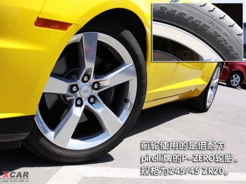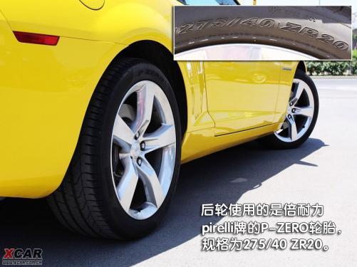 雪佛兰Camaro的转向灯设计得很有意思,在车身侧面前后两端的部位都可以看到,这一风格有些保时捷的味道。而在车身的侧面不仅能看到Camaro的字样,在前轮后边的位置上,还可以看到通用GM的logo,起到了非常不错的装饰作用。五辐铝合金轮毂简洁、硬朗,很符合这款车的风格,同时4只脚上穿得都是倍耐力pirelli牌的P-ZERO款运动鞋,前边两双鞋的尺码为245/45 ZR20,后边两双鞋的尺码为275/40 ZR20。透过轮毂还可看到,前后轮的刹车卡钳上均带有brembo字样。