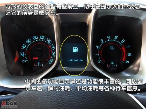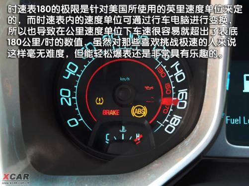 方形的仪表盘的造型有些前卫,似乎在提示人们不要忘记它的前身是概念车。中间的多功能显示屏还是功能很丰富的,可以显示车速、瞬时油耗、平均油耗等各种行车信息。在右侧红区表底9000转的转速表内,可以看到SS的小logo。左边的时速表实在有些不够让人心动,为什么这么说呢,因为时速表的表底数值为180,难道Camaro SS这么强大超级跑车最高时速只能达到180公里/时,不是之前官方说288公里/时吗?据工作人员介绍,180的极限数值是针对美国所使用的英里速度单位来定的,而时速表内的速度单位可通过行车电脑进行变换,所以也导致Camaro SS在公里/时的速度单位下,很容易就超出表底180的最高车速,虽然对于那些喜欢挑战极速的人来说180公里/时实在是毫无难度,但能够如此轻松爆表还是非常具有乐趣的。
