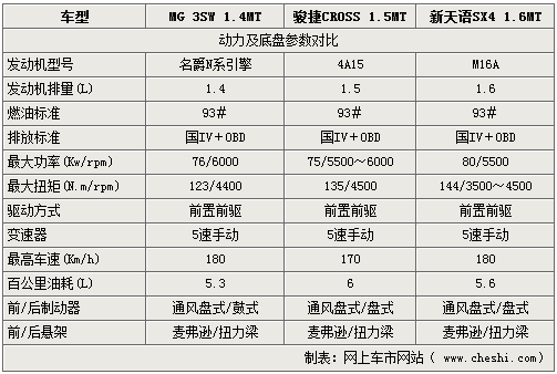 在动力方面,三款车型的排量分别为1.6L,1.5L以及1.4L,在排量不同的基础上,天语以及名爵MG3在功率输出方面表现更佳,而骏捷CROSS则在扭矩的输出方面表现的较为突出。最高车速方面三车相差仅10公里/每小时,底盘的悬架设计也基本一致,但是骏捷CROSS的前后盘式制动显然要优于MG3的前盘后鼓的制动设计,而排量更高的天语则凸显了日系车的油耗优势。