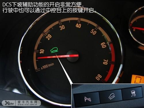 DCS下坡辅助功能的开启非常的方便,即使在行驶中也可以通过中控台上的按键开启。不过,这项功能由于是通过车辆本身的刹车系统进行车速控制,如果是在较陡的坡上就会显得车速过快,每当车速超到10公里/每小时,刹车系统就会自动工作,速度降下来后,刹车系统又会完全解除,紧接着车速又达到车速上限,刹车再次启动,连续的刹车使轮胎多次出现打滑,于是我们又不得不转由人工均匀的控制刹车来保持稳定的车速。