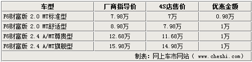 据销售人员介绍,目前比亚迪F6财富版全系可最高优惠万元现金。在售车型涵盖4款车型两个排量,2.0L的两款手动车型以及2.4L的两款自动档车型。购车同时还有部分内外装饰或保养优惠赠送。