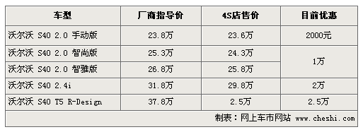 据4S店销售人员介绍:目前沃尔沃S40优惠幅度相比之前有所减少,2.0手动车型仅优惠2000元,2.0 DSG车型最高优惠1万元,2.4车型与2.5T车型都达到2万元的优惠。不过目前手动车型无现车,订车需等一个月。2.5T车型也较少,颜色并不齐全。相对而言,2.0自动档与2.4车型现车较充足。