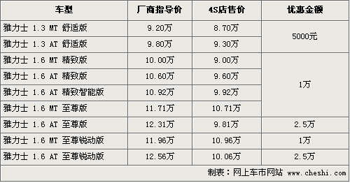 雅力士在欧洲是一款非常受欢迎的A0级小车,但在08年进入国内销售后,其销量并不乐观,但是从这款车的配置、安全性方面,仍然是一款值得购买的小车。根据网上车市价格监测系统显示,目前这款车最高优惠幅度达到了2.5万元,其中有少量装载进口发动机的1.6排量车型仍有销售,具体行情如下: