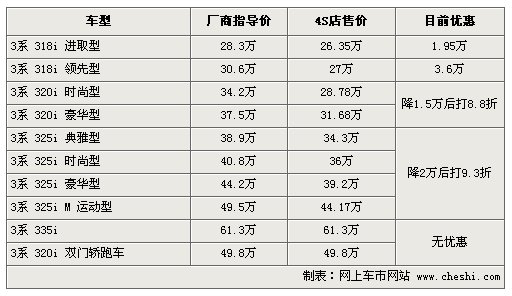 据4S店销售人员介绍:目前宝马3系全部大幅降价,最高降幅达到5.8万元。宝马318系列目前低配车需要预订,订车周期为1个月,高配车型可优惠3.6万,对于一款上市未满一个月的新车而言,有着较高的性价比。宝马320系列两款车型可以降1.5万后优惠8.8折,325系列可优惠2万后打9.3折。宝马335i和320i双门轿跑车无任何优惠,预定车需等6个月。目前宝马3系系列下10款车型现车均不多,预订最短需等10天左右,最长需等半年。