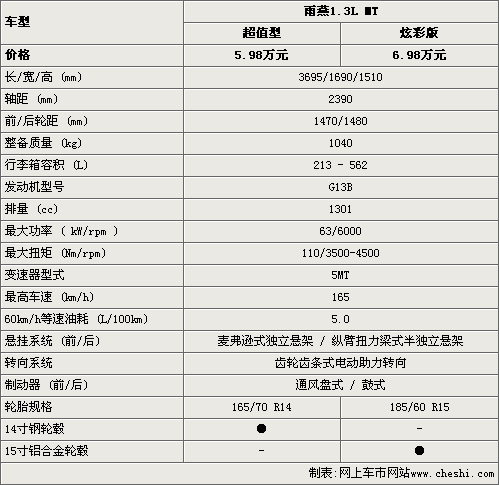雨燕1.3L超值型的售价为5.98万元,比炫彩版要便宜一万元,在车身尺寸和动力性能方面,这款新车都没有任何变化。但雨燕1.3L超值型只配备了14寸钢轮毂和14寸轮胎,而炫彩板则配备的是15寸铝合金轮毂是15寸轮胎。总的来说,雨燕超值型整车的性能基本上并没有变化。
