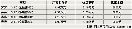 据销售人员介绍,奔奔08款目前现车比较齐全,而且优惠幅度比前一段时间也有了提高。原来购买奔奔08款只能赠送购置税,随着销售压力及市场竞争的不断提高,目前奔奔08款最高可以优惠五千元。