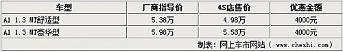 据销售人员介绍,奇瑞A1目前可以优惠4000元,但豪华型现车不足,部分颜色需要预订。而且个别4S店的并没有豪华型现车,也需要预订,订金为2000元。