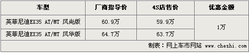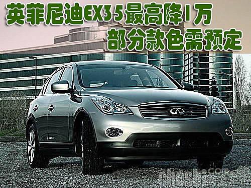 目前销售的英菲尼迪EX35系列车型,最高可优惠现金1万元,但是款式和颜色并不太齐全。英菲尼迪EX35车身颜色共有8种,分别是莹贝白、水亮银、樱彩银、海湾青、水银灰、辉光蓝、玻璃黑和秋枫粟。目前只有水亮银有部分现车,其他均需要预订。