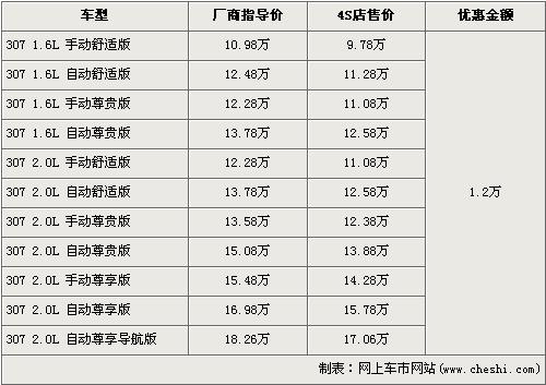 东风标致307和东风雪铁龙世嘉都是出自于PAS二号平台平台的车型。据东风标致经销店销售人员介绍,三厢标致307分为1.6L和2.0L两种排量,目前全系优惠1.2万元。入门车型的1.6L 手动舒适版原厂商指导价为10.98万元,经优惠后仅售9.78万元,排量稍大的2.0L排量的低配车型2.0L 手动舒适版售价也下落,优惠后的售价为11.08万元。