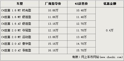 目前C4世嘉全系优惠金额4000元。目前,C4世嘉全系最低配的1.6L手动时尚型售价从原厂商指导价10.88万元降至10.48万元,黑内饰的2.0L手动运动型售价也降至到了13.48万元。销售人员还介绍,目前店内现车以银色为主。现在消费者购车除了可以得到现金优惠外,还可以得到商家赠送的原厂汽车装饰。