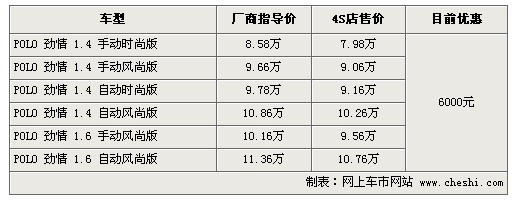 上海大众POLO和一汽斯柯达晶锐都是出自于大众PQ25平台的车型。据上海大众4S店销售人员介绍:目前POLO劲情系列优惠6000元,但车源比较紧张,大多数车型需要预订,预定时间在1个月至2个月不等,由于某些车型销量较少或颜色较少,这就需要更长的等待时间。银色、白色等需要等待1个月左右。