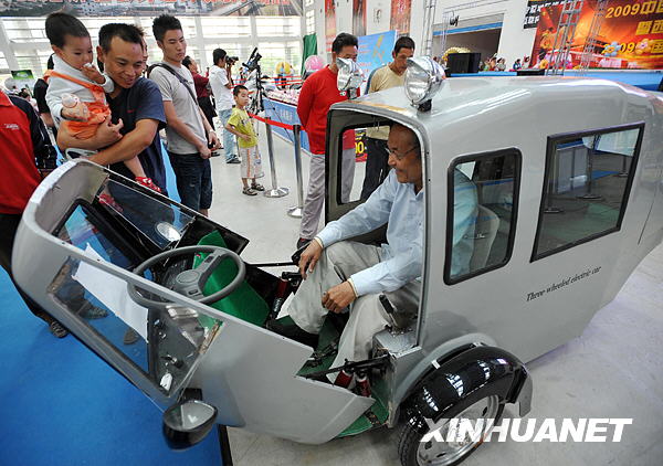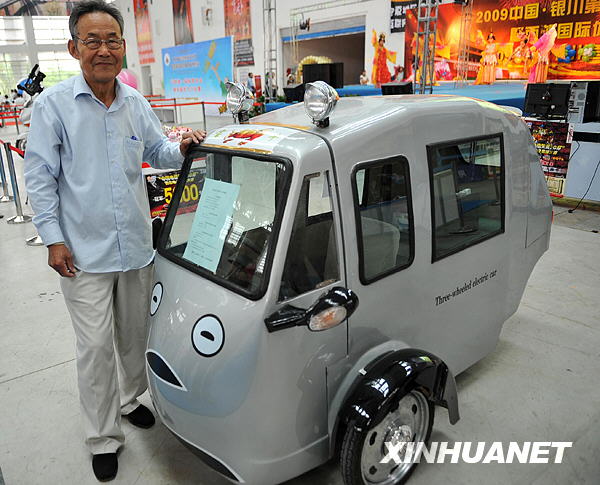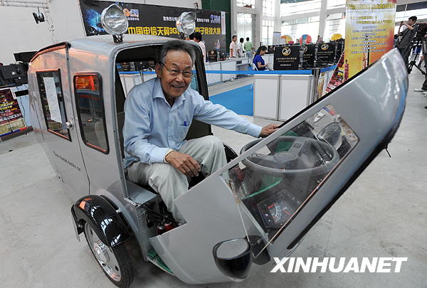 在7月10日举办的银川休闲文化节上,72岁高龄的银川市民孙兆文自己动手设计制作的一辆环保电动三轮车亮相文化节展会现场,吸引众多市民目光。