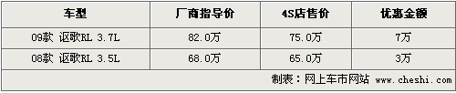 据4S店销售人员介绍,目前老款的讴歌RL还有部分车型在售,原来厂商指导价格为68万元,现在优惠现金3万元,而09款RL现金直降达到了7万元,优惠后售价为75万。现车方面有黑色、炭灰色外观,其他颜色还需要进一步预订。