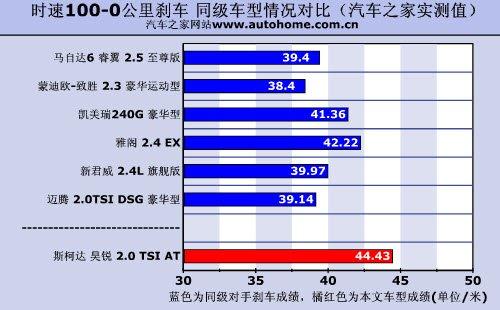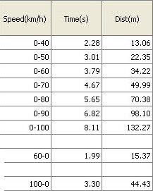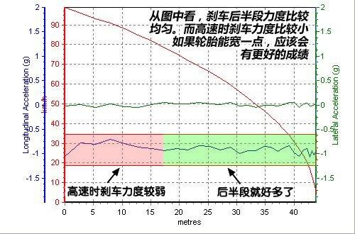 同样在刹车测试时,205轮胎还是拖了后腿,抓地力实在有限。最终刹车的平均成绩是44.4米,这已经是能接受的极限了。如果换上大一号的轮胎,刹车成绩能提高到42米左右就比较理想了。