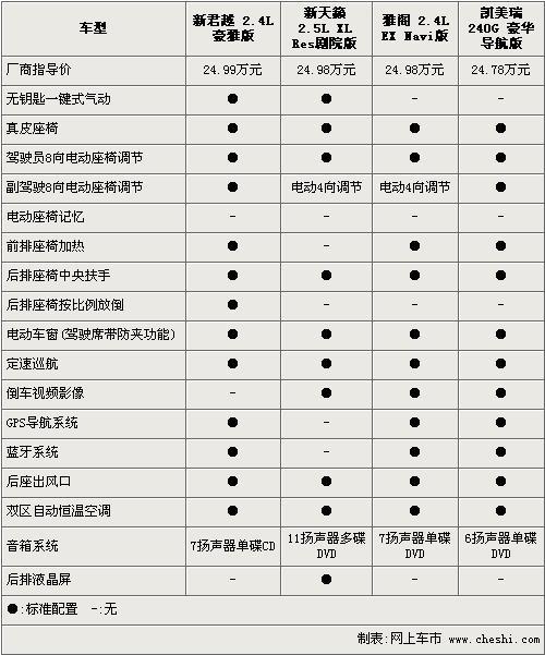 总结:通过以上对四款车型的对比,相信大家在心里都会选出了一款更加符合自己心中定位的车型。如果您希望自己的爱车更大更有型更另类,那么您可以选择带着新家族特征和拥有更大内部空间的新君威;如果您希望自己的爱车很“男人”,并且在低调中可以凸显个性,那么您可以选择“阳刚味儿”十足的新雅阁;如果您希望自己的爱车在平庸间又不失大气,那么新凯美瑞绝对是您的不二选择;如果您很注重爱车娱乐舒适性方面的配置,那么新天籁2.5L XL Res剧院版绝对不会辜负您的希望,会让您和乘客都会有一个有趣并且愉快的旅程。