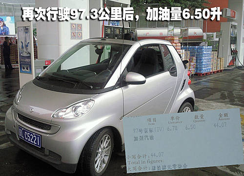北京的早晚高峰时段拥堵情况相信是车主们众所周知的,因此我们选择在这个时段去模拟油耗测试也是为了向大家展现这款车型在类似工况下的油耗情况。经过测试记者所驾驶的Smart fortwo在行驶了97.3公里后耗费燃油6.5升,平均百公里油耗为6.68升。虽然这样的油耗水平看上去比较高,但这是在记者全程打开顶棚的状态下的成绩,因为我们考虑到这样的敞篷小车在60公里/小时以下时速的顶棚开启率很高,而开启顶棚车辆的风阻系数要远远大于关闭状态。