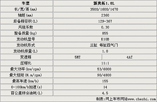 今年下半年将在长安铃木投产的新奥拓,长宽高分别达到3500/1600/1470毫米,轴距为2360毫米,与长安奔奔等车型同一级别。铃木全新奥拓车型即将在重庆工厂投产,是长安铃木的第五款车型。