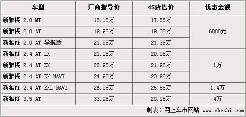 据4S店销售人员介绍,目前购买新雅阁各款车优惠金额有差别。2.0排量车型购车可优惠现金6000元,优惠完车价最低为17.58万,但这款现车不多,2.0自动档两款有黑色、银色等供应。除此之外,2.4排量三款车优惠现金1万元,高配则能给出1.4万优惠,3.5排量仍然现车紧张,需要预订。订车后仍能享受优惠,最高优惠4万元。