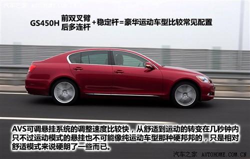 GS450h上装配的AVS适应式可调悬挂系统,可以自动连续调整减震器的阻尼。当然,也可以通过人工设置,分为普通和运动两种状态。普通模式下,悬挂和减震系统更多的顾及车内舒适程度,偏软的悬挂和松软舒适的座椅让驾驶员很难有想深踩油门的冲动,大部分的路感被悬挂系统吸收,传进车内的只有少数幅度稍大一点的波动;运动模式下的悬挂系统表现得相对更敏感,对路面信息的传递也更清晰一些,但还谈不上纯正的运动车型的那种硬邦邦的悬挂调校,毕竟这不是那一类型的车。