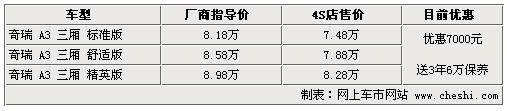 据4S店销售人员介绍:目前奇瑞A3 1.6升三厢现车充足,颜色齐全,银色、白色等车型可供挑选。目前A3可优惠7000元现金,并送3年6万公里保养,这不仅可以在买车的时候得到一定的优惠,而且在今后养车方面也为消费者省下一笔不少的开支。