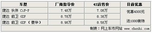 据4S店销售人员介绍:目前捷达三款车型最高优惠可达4000元,较之前优惠幅度有所增加,并且捷达伙伴店内现车非常充足,相比之下捷达前卫现车不是非常多,颜色不是非常齐全。购捷达4S店还可送1000元装饰,包括地胶、脚垫等最常用的装饰。