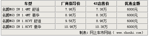 时值销售旺季,各厂商纷纷拿出看家本领提高销量。网上车市网站由经销商处了解到,现在到店购买MG3 SW系列车型仅优惠6000元,相比前一段时间的万元优惠有大幅度的缩水。具体详情如下: