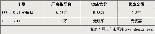 据比亚迪汽车北京地区4S店销售人员介绍,目前北京在售的比亚迪F3R有两款车型。1.5L手动舒适版经2000元的优惠后售价从6.08万降到了5.88万元,1.6L自动档车型目前店内没有现车,所以不在此次优惠队列中。