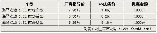 海马欢动1.6L系列车型已经上市有段时间了,售价在7.96万至9.26万之间。网上车市网站由北京地区经销商处了解到,现在购车均有千元的现金优惠。另外一款上市时间较长的1.8L系列车型 ,全系车型则最高可给出9千元的现金优惠。具体详情如下: