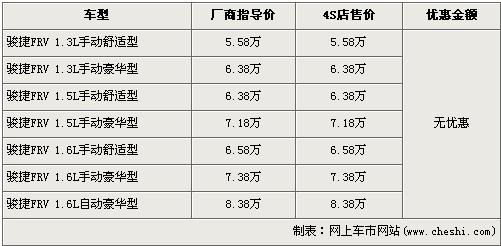 据经销商处销售人员介绍,骏捷FRV在售车型已经扩大到了7款,新增加了分为舒适版和豪华版的手动1.5L排量车型。目前购买骏捷FRV的消费者在现金方面没有任何优惠,并且全系1.3L和1.6L车型均无现车,1.5L排量车型现车数量一般,如果错过此批现车的消费者需交订金2000元,最早半个月后提车。
