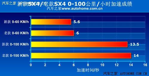 这加速测试中,新款SX4起步时对车身姿态控制不错,1.6L AT运动型的百公里加速最好成绩为13.5秒,比老款车型的14秒略有提升。不过从绝对数值上看,13.5秒仍是一段比较“漫长”的时间。