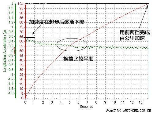 从加速图表中大家可以看到,1.6L+4AT的组合能够提供的加速度十分有限,加速G值在起步阶段达到最大后就开始呈现衰弱的趋势。但值得注意的是,4AT变速箱只用了两挡就完成了百公里加速,且在仅有的一次换当中,其过渡的平稳程度也令人满意,进一步证明了SX4在日常驾驶中的平顺性。