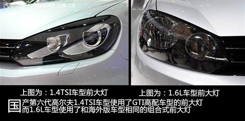 第六代高尔夫1.6L车型外观和1.4TSI基本一致,只是在前大灯、轮胎、尾部标识和排气管上面会有一定的区别,其中区别最大的就是前大灯,国产1.4TSI车型采用了GTI顶配车型上面的透射式大灯,而1.6L车型是采用了和海外高尔夫车型一样组合式大灯。