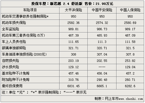 在太平洋、平安、中保等三家保险公司的保险项目里,机动车交通事故责任强制保险是一项强制保险项目,并且价格统一为950元整。除此之外,三家保险公司的车险项目基本保持一致,但相应的费率存在一定的浮动,其中中国人民保险的报价最低,太平洋保险的报价最高。另外,在机动车第三者责任险中,消费者除了可以选取5万保险额外,还可以选择10万、15万、20万元保额等。而在车身油漆单独损伤险(常说的划痕险)方面,消费者也可以选取更高的保额如5000元、10000元不等。由于新车在第一年里属于汽车厂商的保修范围之内,所以自燃损失险可以不上。值得一提的是“不计免赔”这个险种,购买这个险种的最终的是消费者出险后保险公司可以百分之百的赔偿,反之则只能按照比例部分赔偿。