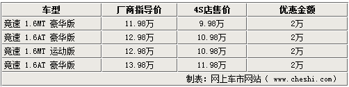 近日,青年汽车旗下车型-莲花竞速传出很快将完全国产化的消息,在前段时间厂家调价降10000元后,市场价格再次出现波动。据网上车市网站了解,青年莲花竞速车型在北京市场也出现了更多的优惠政策,现在购车将在厂家调价的基础上再优惠1万,最低价格已经下探至9.68万。具体详情如下: