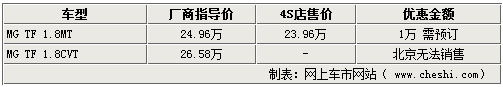 与比亚迪S8同为敞篷跑车设计的MG TF跑车在北京市场仍为订单销售状态。网上车市网站由北京名爵经销商处了解到,现在购买名爵MG TF跑车,虽然在价格上有万元的优惠,但是各店均无现车,需要提前预订,具体详情如下: