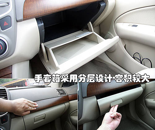 东风日产新轩逸的手套箱有阻尼设计,在打开手套箱后不会因重力而自由下落,手套箱容积比较大,并采用分层设计,可存放不少物品。