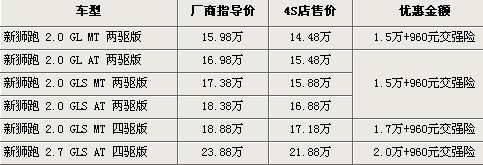 据4S店销售人员介绍,目前购买狮跑可以赠送960元的交强险,同时有1.5万-2万元不等的现金优惠。两驱标准版优惠后售价仅为14.48万元。目前经销商处有黑色、银色等现车供应,蓝色等款需要预定,订金为2千元,月内便可以顺利提车。