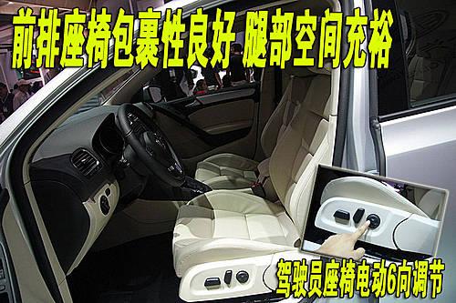 第六代高尔夫整车座椅均采用真皮材料,驾驶席座椅前后、靠背角度、座椅高度为电动调节。各按钮四周做工较细致,但感觉比较松垮。乘坐时可以感觉到前排座椅对于背部的支撑与包裹十分到位,同时前排座椅坐垫长度也很合适,对大腿部分的支撑充足。