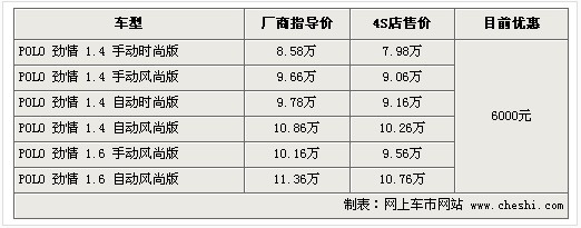 据4S店销售人员介绍:目前POLO劲情系列优惠6000元,但车源比较紧张,所有车型需要预订,预定时间在20天到一个半月不等。另外编辑从经销商处得知,冰蓝色车型订车时间最短,而比较畅销的红色、银色等需要等待较长时间,如果急于购车,请安排好提车时间。