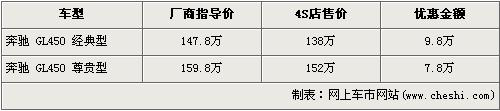 据经销商处销售人员介绍,目前国内在售的奔驰GL级分为GL450 经典版与GL450 尊贵版,近日奔驰GL系的最高优惠9.8万元。经9.8万元优惠后,低配的GL450经典版售价降到了138万元。高配的尊贵版经7.8万元优惠后,售价从159.8万元降到了152万元。