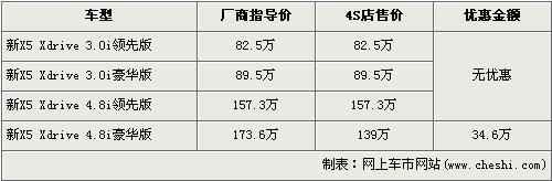 据经销商处销售人员介绍,近期购买X5的消费者可以得到最高34.6万元的优惠。新款的宝马X5 3.0i领先版车型、3.0i豪华版和4.8i领先版店内均无现车,4.8i豪华版经34.6万元优惠后,售价从173.6万元下降到了139万元。