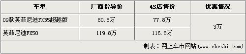 据英菲尼迪4s店销售人员介绍,目前店内销售的FX系列有FX50和09款FX35两款车型,并且近期都有3万元的优惠。经优惠后,英菲尼迪FX50售价从119.8万元降到了116.8万元。09新款的FX35超越版售价也降到了77.8万元。