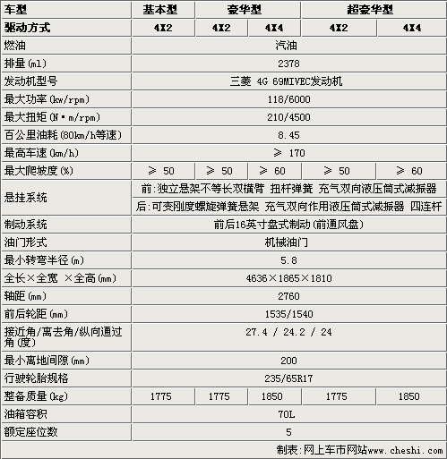 据悉,陆风X8的汽油版共有五款车型,包括三款两驱车型和两款四驱车型,都搭载2.4L发动机,最大功率为118千瓦,最大扭矩为210牛。陆风X8的百公里等速油耗是8.45L,最高车速可达170千米/小时以上。这款车采用了前后16英寸盘式制动,前制动器采用通风盘式,并采用前独立悬挂和双向筒式液压减震器、后四连杆悬挂并配备了螺旋弹簧,提高了整车的舒适型。
