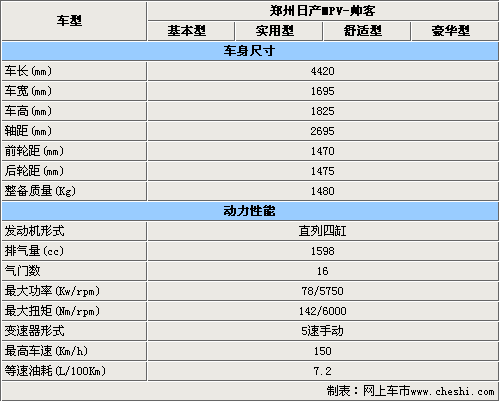 郑州日产即将投产的帅客分为四款车型,这四款车型的长宽高都分别达到4420/1695/1825毫米,轴距也达到了2695毫米,这些数据确保了其宽敞的内部空间。1470毫米和1475毫米的前后轮距保障了帅客的操控性能。动力方面帅客搭载了1.6升直列四缸发动和5速手动变速箱,最高时速可以达到150公里/小时。