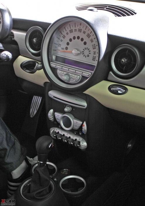 坐进MINI的车内,一个圆形的白色大仪表盘非常惹眼,可电子显示车速、油量、冷却剂以及其他功能状态等信息。这种布局自从1968年以来一直是MINI典型特征。控制台下方带有6个条形小开关是从原创MINI继承而来的,这些开关均为弹簧式按钮,使用后自动弹回原来状态。